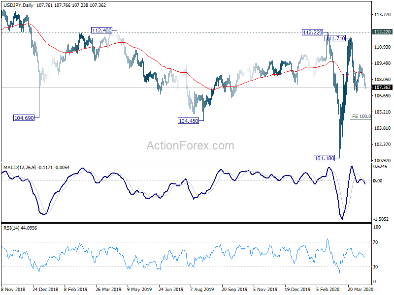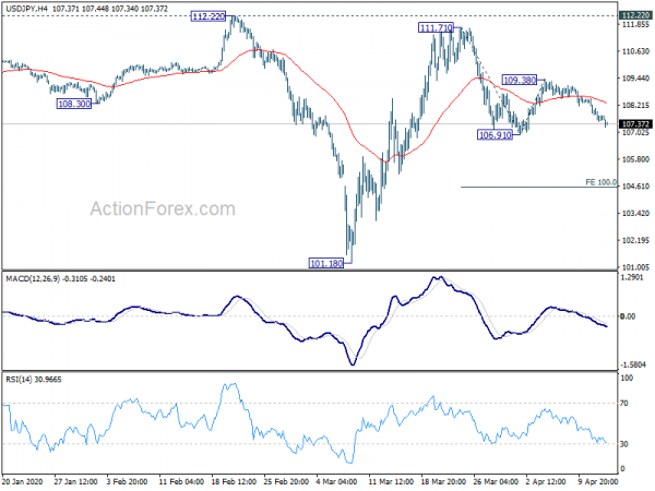 USD/JPY is still bounded in range above 106.91 and intraday bias remains neutral first. On the downside, break of 106.91 will resume the fall from 111.71 and target 100% projection of 111.71 to 106.91 from 109.38 at 104.58. On the upside, break of 109.38 will suggest that fall from 111.71 has completed. Intraday bias will be turned back to the upside for 111.71/112.22 resistance zone.