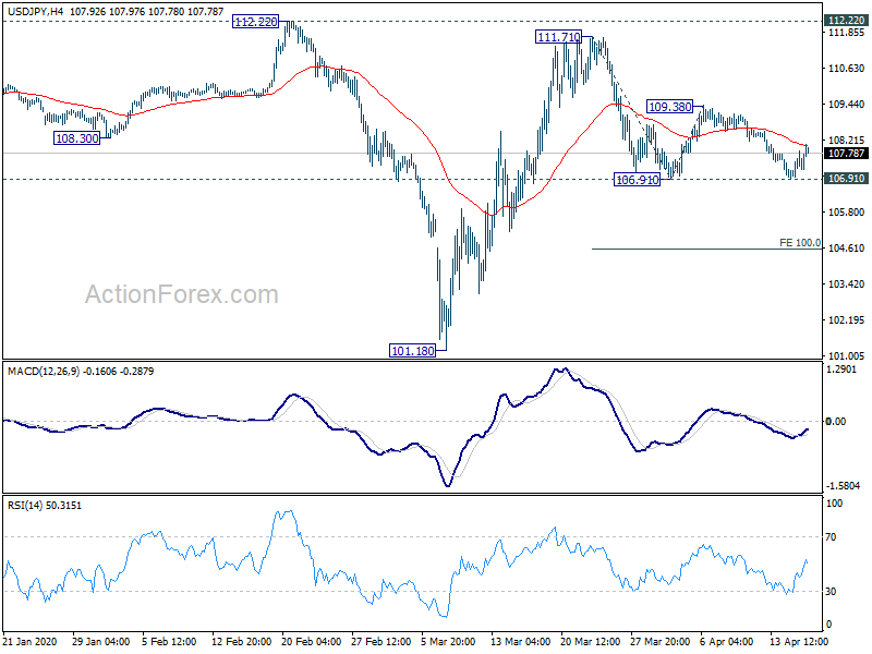 Intraday bias in USD/JPY remains neutral for the moment. On the downside, firm break of 106.91 support will resume whole decline from 111.71. Intraday bias will be turned to the downside for 100% projection of 111.71 to 106.91 from 109.38 at 104.58. On the upside, break of 109.38 will suggest that fall from 111.71 has completed. Intraday bias will be turned back to the upside for 111.71/112.22 resistance zone.