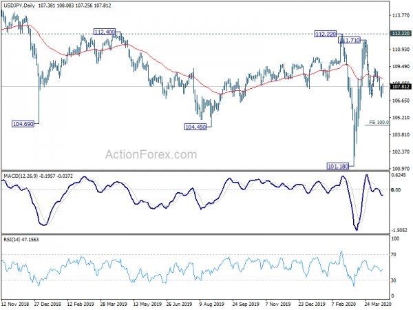 In the bigger picture, at this point, whole decline from 118.65 (Dec 2016) continues to display a corrective look, with well channeling. There is no clear sign of completion yet. Break of 101.18 will target 98.97 (2016 low). Meanwhile, sustained break of 112.22 should confirm completion of the decline and turn outlook bullish for 118.65 and above.