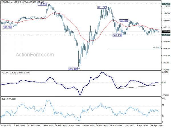 Range trading continues in USD/JPY and intraday bias remains neutral first. On the downside, break of 106.91 will extend the decline from 111.71 to 100% projection of 111.71 to 106.91 from 109.38 at 104.58. On the upside, break of 109.38 will suggest that fall from 111.71 has completed. Intraday bias will be turned back to the upside for 111.71/112.22 resistance zone.