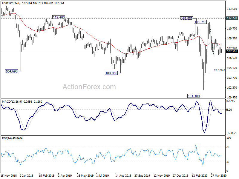 In the bigger picture, at this point, whole decline from 118.65 (Dec 2016) continues to display a corrective look, with well channeling. There is no clear sign of completion yet. Break of 101.18 will target 98.97 (2016 low). Meanwhile, sustained break of 112.22 should confirm completion of the decline and turn outlook bullish for 118.65 and above.