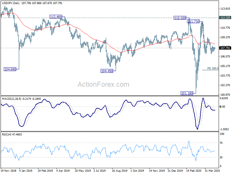 In the bigger picture, at this point, whole decline from 118.65 (Dec 2016) continues to display a corrective look, with well channeling. There is no clear sign of completion yet. Break of 101.18 will target 98.97 (2016 low). Meanwhile, sustained break of 112.22 should confirm completion of the decline and turn outlook bullish for 118.65 and above.