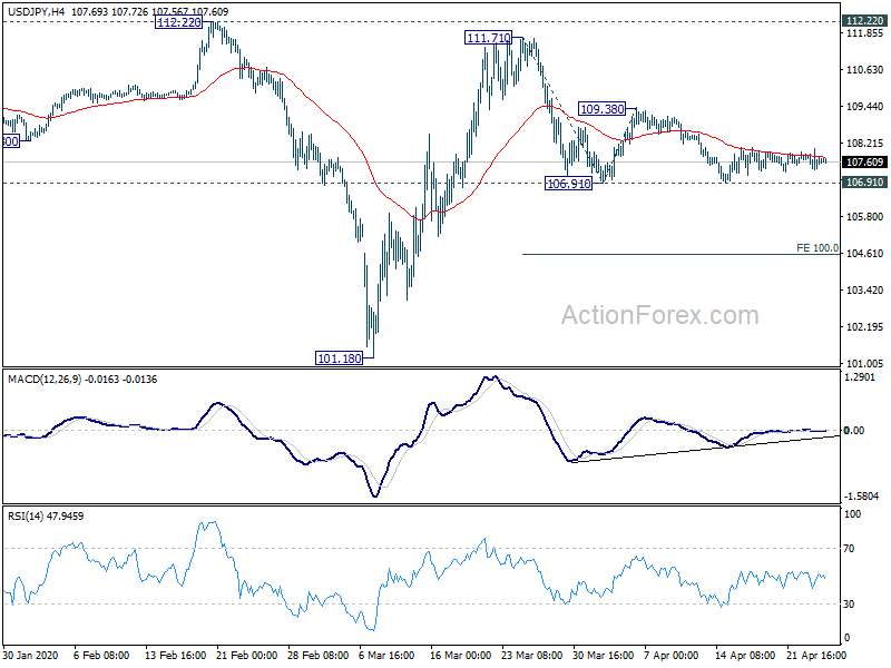 No change in USD/JPY’s outlook and intraday bias remains neutral. On the downside, break of 106.91 will extend the decline from 111.71 to 100% projection of 111.71 to 106.91 from 109.38 at 104.58. On the upside, break of 109.38 will suggest that fall from 111.71 has completed. Intraday bias will be turned back to the upside for 111.71/112.22 resistance zone.