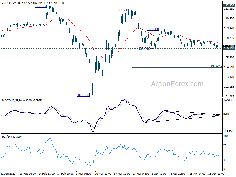 No change in USD/JPY’s outlook as intraday bias remains neutral first. On the downside, break of 106.91 will resume the decline from 111.71 to 100% projection of 111.71 to 106.91 from 109.38 at 104.58. On the upside, break of 109.38 will suggest that fall from 111.71 has completed. Intraday bias will be turned back to the upside for 111.71/112.22 resistance zone.