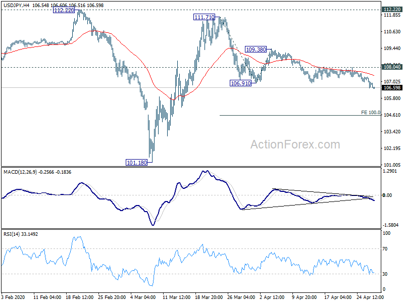 Intraday bias in USD/JPY remains on the downside as fall from 111.71 is still in progress. Deeper fall would be seen to 100% projection of 111.71 to 106.91 from 109.38 at 104.58 next. Momentum of the current decline and reaction from 104.58 should reveal whether USD/JPY is resuming larger down trend. On the upside, break of 108.04 resistance is needed to indicate short term bottoming. Otherwise, further fall will remain in favor even in case of recovery.