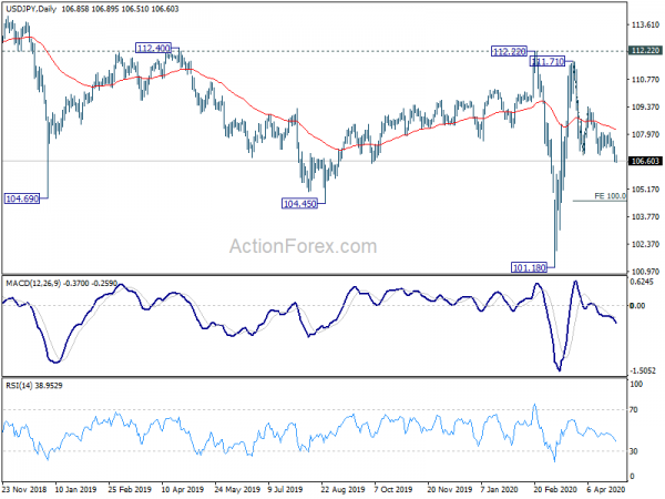 In the bigger picture, at this point, whole decline from 118.65 (Dec 2016) continues to display a corrective look, with well channeling. There is no clear sign of completion yet. Break of 101.18 will target 98.97 (2016 low). Meanwhile, sustained break of 112.22 should confirm completion of the decline and turn outlook bullish for 118.65 and above.