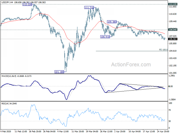 Intraday bias in USD/JPY remains on the downside for the moment. Current fall from 111.71 should target 100% projection of 111.71 to 106.91 from 109.38 at 104.58 next. Momentum of the current decline and reaction from 104.58 should reveal whether USD/JPY is resuming larger down trend. On the upside, break of 108.04 resistance is needed to indicate short term bottoming. Otherwise, further fall will remain in favor even in case of recovery.