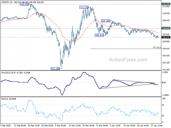 USD/JPY’s fall from 111.71 is still in progress even though downside momentum is diminishing a little it, as seen in 4 hour MACD. Intraday bias stays on the downside for 100% projection of 111.71 to 106.91 from 109.38 at 104.58 next. Momentum of the current decline and reaction from 104.58 should reveal whether USD/JPY is resuming larger down trend. On the upside, break of 108.04 resistance is needed to indicate short term bottoming. Otherwise, further fall will remain in favor even in case of recovery.