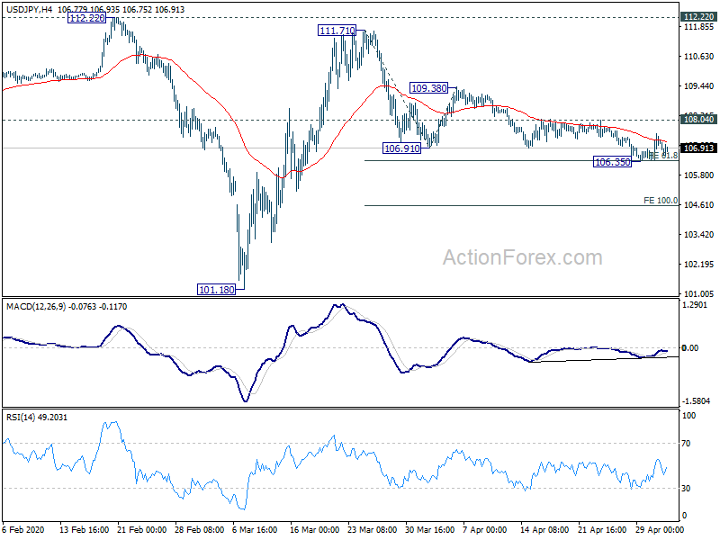 USD/JPY dropped to 106.35 last week but recovered since then. Some support was seen from 61.8% projection of 111.71 to 106.91 from 109.38 at 106.41. Yet, the strength of the recovery was very limited. Initial bias remains neutral this week first. On the downside, break of 106.35 will target 100% projection of 111.71 to 106.91 from 109.38 at 104.58. Reactions from there could reveal whether fall from 111.71 is corrective or impulsive. On the upside, break of 108.04 resistance will suggest completion of the fall form 111.71 and target 109.38 resistance next.