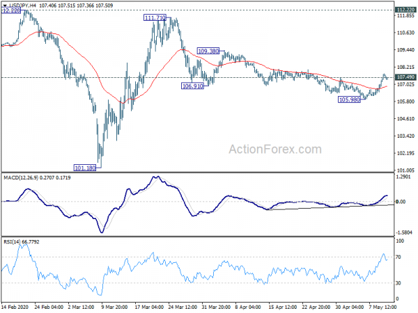 USD/JPY’s break of 107.49 resistance suggests that corrective fall from 111.71 has completed already, with three waves down to 105.98. Intraday bias is back on the upside for 109.38 resistance first. Break there will target a retest on 111.71. For now, risk will stay on the upside as long as 105.98 support holds, in case of retreat.