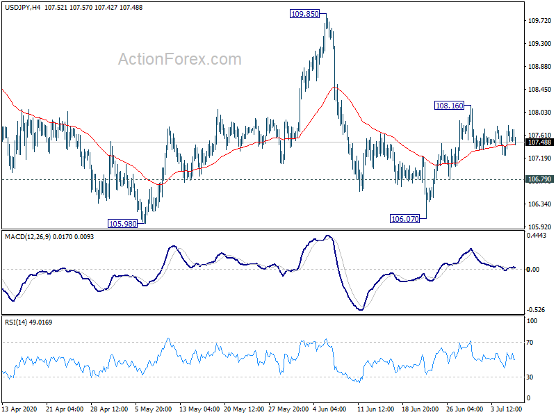 USD/JPY is staying in consolidation below 108.16 temporary low and intraday bias remains neutral first. Further rise is in favor as long as 106.79 support holds. On the upside, break of 108.16 will resume the rebound from 106.07 to 109.85 resistance next. Break will argue that larger rebound from 101.18 might be resuming to 112.22 key resistance. On the downside, below 106.79 minor support will dampen the bullish case and turn bias back to the downside for 106.07 instead.