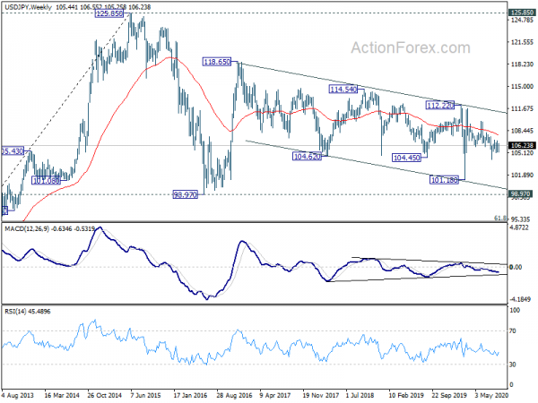 In the bigger picture, USD/JPY is still staying in long term falling channel that started back in 118.65 (Dec. 2016). Hence, there is no clear indication of trend reversal yet. The down trend could still extend through 101.18 low. However, sustained break of 112.22 should confirm completion of the down trend and turn outlook bullish for 118.65 and above.