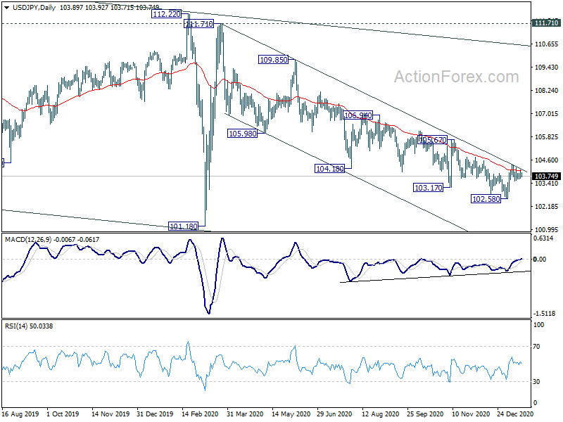 In the bigger picture, USD/JPY is still staying in long term falling channel that started back in 118.65 (Dec. 2016). Hence, there is no clear indication of trend reversal yet. The down trend could still extend through 101.18 low. On the upside, break of 105.67 resistance is needed to be the first signal of medium term reversal. Otherwise, outlook will remain bearish.
