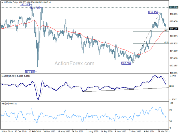 USD/JPY’s fall from 110.95 accelerates to as low as 108.00 so far. Intraday bias remains on the downside for the moment. At this point, we’d still expect strong support from 38.2% retracement of 102.58 to 110.95 at 107.75 to bring rebound. On the upside, above 108.99 support turned resistance will turn bias back to the upside for retesting 110.95 high. However, sustained break of 107.75 will bring deeper fall to 61.8% retracement at 105.77.