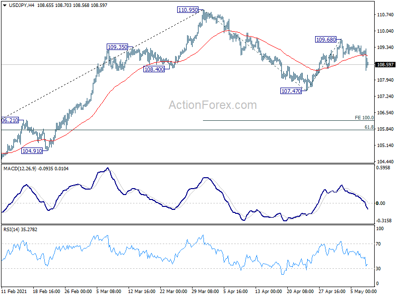 USD/JPY edged higher to 109.68 last week, but subsequent fall argues that rebound from 107.47 might have completed. More importantly, the decline from 110.95 might still be in progress. Initial bias stays on the downside this week for 107.47 first. Break will target 100% projection of 110.95 to 107.47 from 109.68 at 106.20 next. For now, risk will stay on the downside as long as 109.68 resistance holds, in case of recovery.