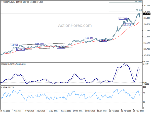 Intraday bias in USD/JPY remains neutral and consolidation from 135.58 could extend. But further rally is expected as long as 131.34 support holds. On the upside, break of 135.58 will resume larger up trend to 61.8% projection of 114.40 to 131.34 from 126.35 at 136.81. Firm break there will target 100% projection at 143.29.