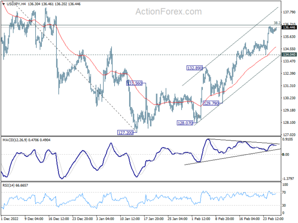 Immediate focus stays on 38.2% retracement of 151.93 to 127.20 at 136.64. Rejection by this fibonacci level, followed by break of 134.04 support, will argue that such rebound from 127.20 has completed, and turn bias back to the downside. However, sustained trading above 136.64 will indicate that fall from 151.93 has completed, and bring further rally to 61.8% retracement at 142.48.