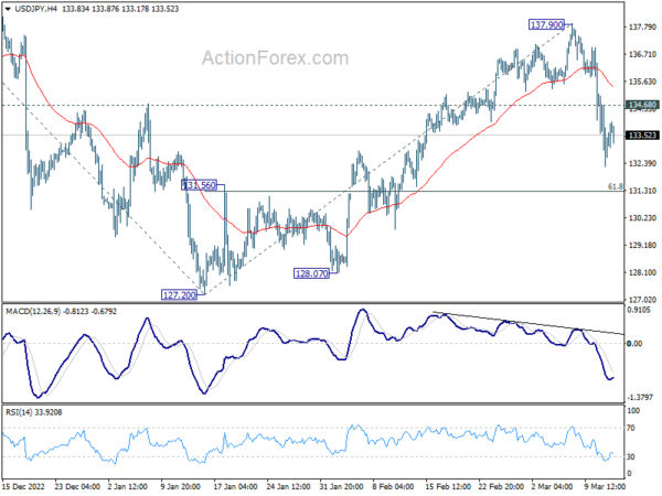 Intraday bias in USD/JPY stays on the downside at this point. Current fall from 137.90 would target 61.8% retracement of 127.20 to 137.90 at 131.28. Sustained break there will pave the way to retest 127.20 low. On the upside, above 134.68 minor resistance will turn intraday bias neutral first.