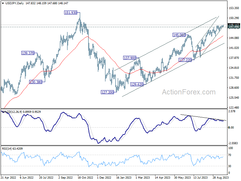 Intraday bias in USD/JPY is back on the upside, as recent rally resumed after brief consolidations. Current rise from 127.20 should target a retest on 151.93 high. On the downside, below 147.49 minor support will turn intraday bias neutral first. But outlook will stay bullish as long as 145.88 support holds, in case of retreat.