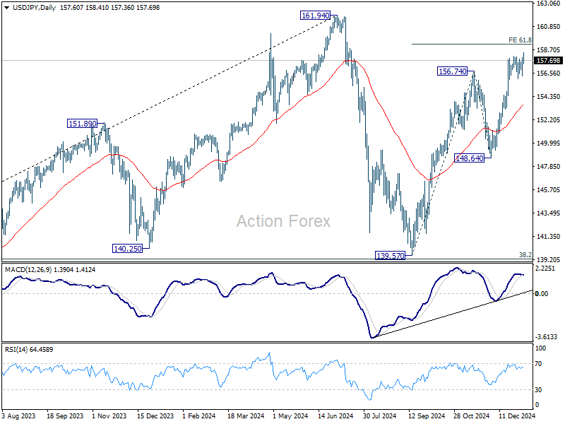 Intraday bias in USD/JPY stays on the upside at this point. Current rally from 139.57 is in progress to 61.8% projection of 139.57 to 156.74 from 148.64 at 159.25. Firm break there will target 161.94 high. However, break of 156.01 support will indicate short term topping, likely with bearish divergence condition. Intraday bias will then be back on the downside for 55 D EMA (now at 153.64) instead.