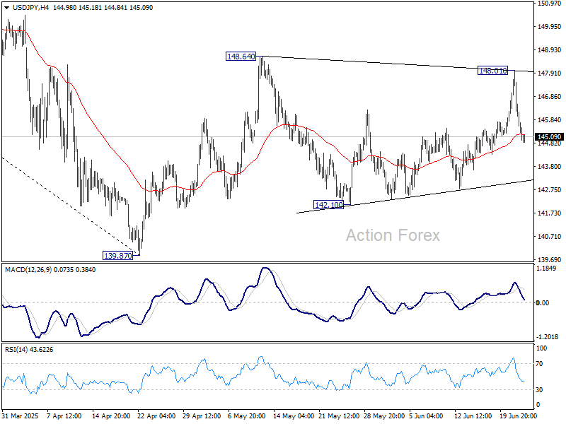 Intraday bias in USD/JPY remains neutral for the moment. Sideway pattern from 148.64 is extending with another falling leg. On the upside. firm break of 148.64 will resume the rise from 139.87 to 61.8% retracement of 158.86 to 139.87 at 151.22.