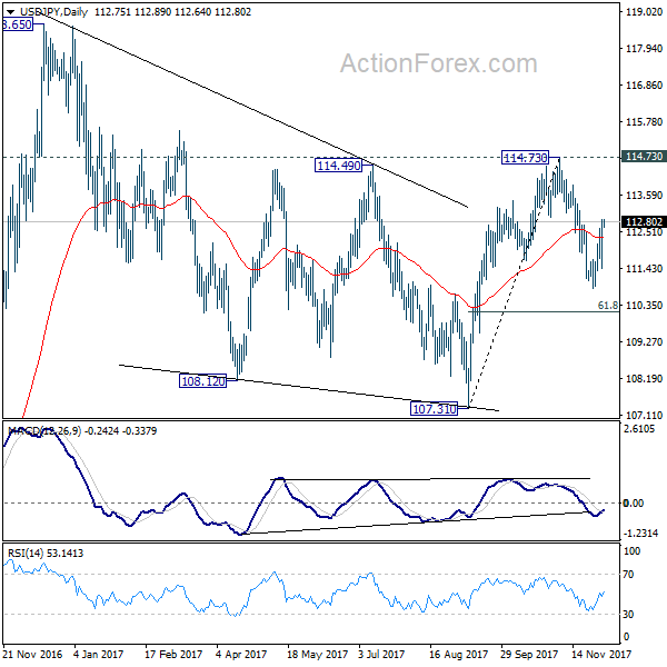 Breach of 112.8y suggests that USD/JPY’s rebound from 110.83 is resuming. More importantly, pull back from 114.73 is likely completed. Intraday bias is back on the upside for retesting 114.73 key resistance. Decisive break there will extend the rally from 107.31 to retest 118.65 high. In case of another fall, we’ll look for bottoming again below 61.8% retracement of 107.31 to 114.73 at 110.14.