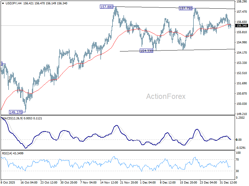 Range trading continues in USD/JPY and intraday bias remains neutral. Outlook will stay bullish as long as 154.33 support holds. On the upside, firm break of 158.85 key structural resistance will be an important medium term bullish sign. Next target will be 161.94 high. However, decisive break of 154.38 will turn bias to the downside for deeper correction.