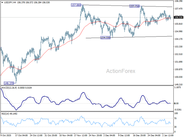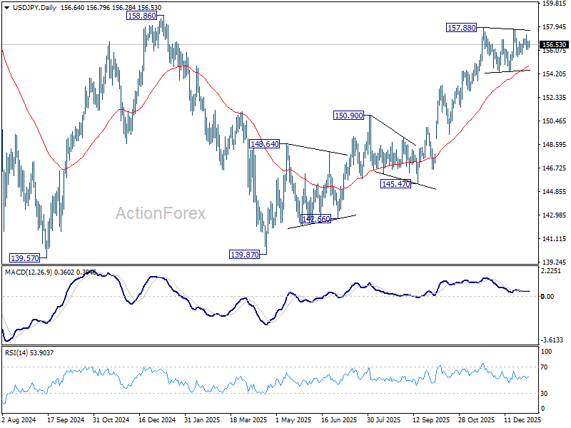 USD/JPY is still bounded in sideway consolidations from 157.88 and intraday bias stays neutral for the moment. Outlook will stay bullish as long as 154.33 support holds. On the upside, firm break of 158.85 key structural resistance will be an important medium term bullish sign. Next target will be 161.94 high. However, decisive break of 154.38 will turn bias to the downside for deeper correction.