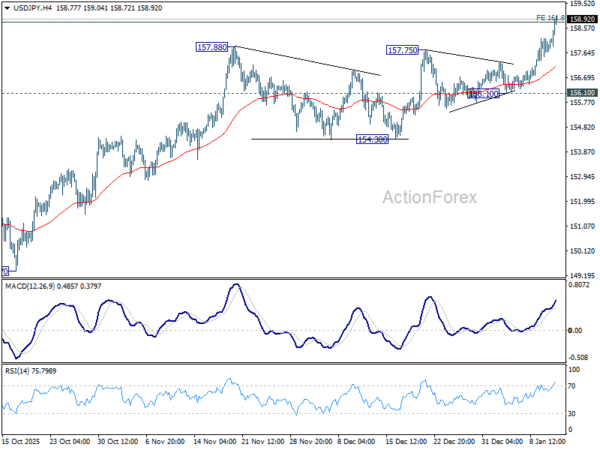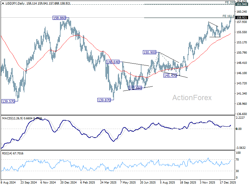 USD/JPY’s rally accelerates higher today and intraday bias stays on the upside. Sustained trading above 161.8% projection of 142.66 to 150.90 from 145.47 at 158.80 will pave the way to 200% projection at 161.95, which is close to 161.94 high. For now, outlook will stay bullish as long as 156.10 support holds, in case of retreat.