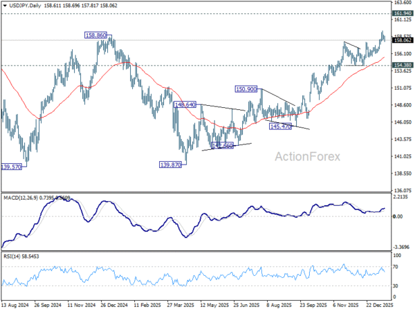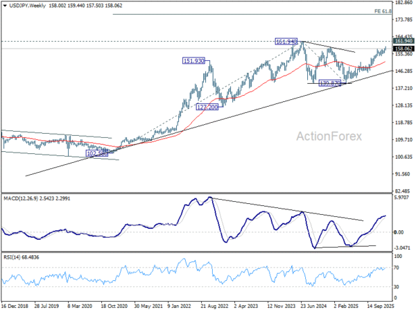 In the bigger picture, corrective pattern from 161.94 (2024 high) should have completed with three waves at 139.87. Larger up trend from 102.58 (2021 low) could be ready to resume through 161.94. Decisive break of 158.86 structural resistance will solidify this bullish case and target 161.94 for confirmation. On the downside, break of 154.38 support will dampen this bullish view and extend the corrective range pattern with another falling leg.