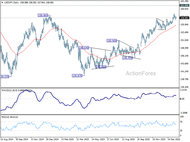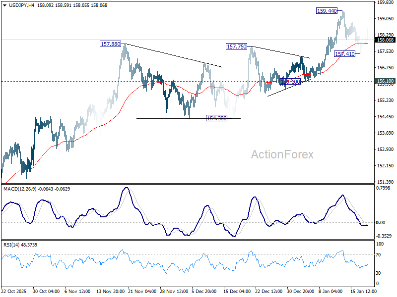 Intraday bias in USD/JPY remains neutral and more consolidations could be seen below 159.44. Outlook remains bullish with 156.10 support intact. On the upside, break of 159.44 will resume the rise from 139.87 towards 161.94 high. However, firm break of 156.10 will confirm short term topping, and turn bias back to the downside for deeper pullback.