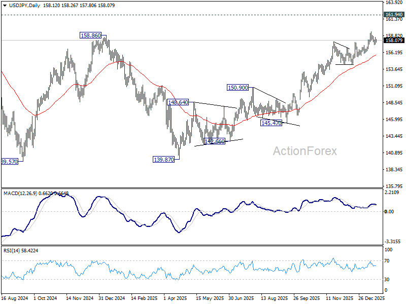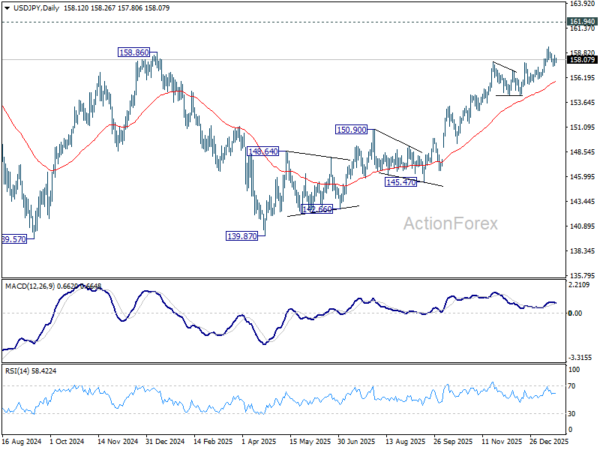 In the bigger picture, corrective pattern from 161.94 (2024 high) should have completed with three waves at 139.87. Larger up trend from 102.58 (2021 low) could be ready to resume through 161.94. Decisive break of 158.86 structural resistance will solidify this bullish case and target 161.94 for confirmation. On the downside, break of 154.38 support will dampen this bullish view and extend the corrective range pattern with another falling leg.