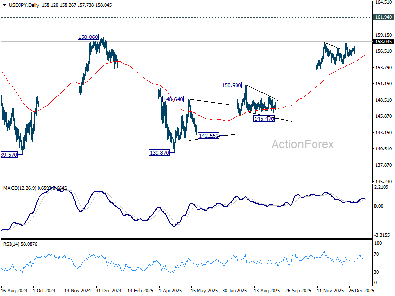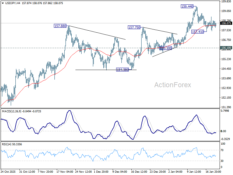 USD/JPY is extending consolidations below 159.44 and intraday bias remains neutral at this point. With 156.10 support intact, outlook remains bullish. On the upside, break of 159.44 will resume the rise from 139.87 towards 161.94 high. However, firm break of 156.10 will confirm short term topping, and turn bias back to the downside for deeper pullback.