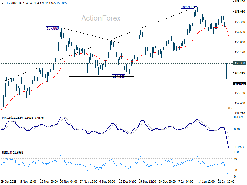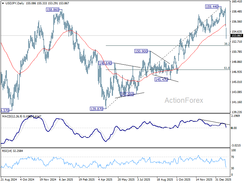 Intraday bias in USD/JPY remains on the downside for the moment. Fall from 159.44 is seen as correcting the rise from 139.87. Deeper fall should be seen to 38.2% retracement of 139.87 to 159.44 at 151.96. Strong support should be seen there to bring rebound, at least on first attempt. On the upside above 155.33 minor resistance will turn intraday bias neutral and bring consolidations first. However, decisive break of 151.96 will argue that it is reversing whole rise from 139.87. Deeper decline would then be seen to 61.8% retracement at 147.34.