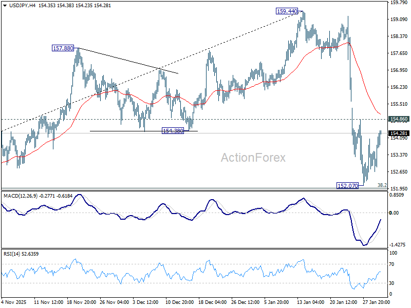 USD/JPY’s recovery extends higher today but upside is still limited below 154.86 resistance. Intraday bias stays neutral. As noted before, fall from 159.44 is seen as correcting the rise from 139.87. Strong support should be seen from 38.2% retracement of 139.87 to 159.44 at 151.96 to bring rebound, at least on first attempt. On the upside above 154.86 minor resistance will turn intraday bias to the upside for recovery. However, decisive break of 151.96 will argue that it is reversing whole rise from 139.87. Deeper decline would then be seen to 61.8% retracement at 147.34.