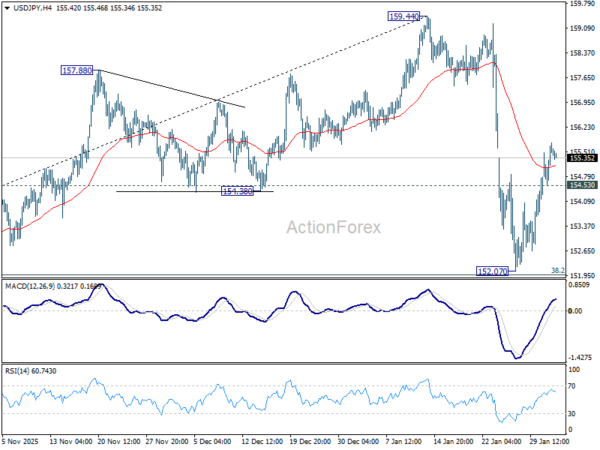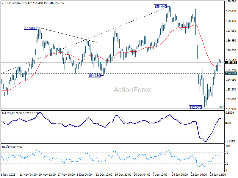 Intraday bias in USD/JPY remains mildly on the upside at this point. Rise from 152.07 is seen as the second leg of the corrective pattern from 159.44. Further rebound should be seen to retest 159.44 next. On the downside, below 154.53 minor support will turn intraday bias neutral first. Sustained break of 38.2% retracement of 139.87 to 159.44 at 151.96 will argue that it is reversing whole rise from 139.87.