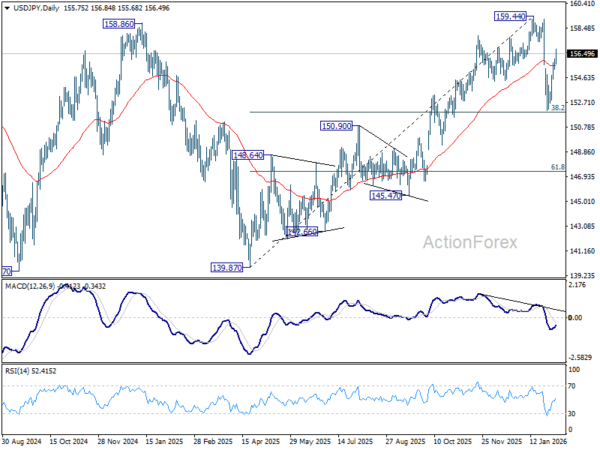 No change in USD/JPY’s outlook and intraday bias stays on the upside. Rise from 152.07 is seen as the second leg of the corrective pattern from 159.44. Further rebound should be seen to retest 159.44 next. On the downside, below 154.53 minor support will turn intraday bias neutral first. Sustained break of 38.2% retracement of 139.87 to 159.44 at 151.96 will argue that it is reversing whole rise from 139.87.