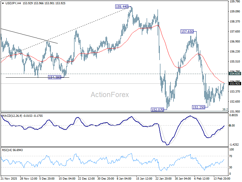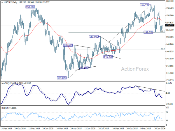 Intraday bias in USD/JPY remains neutral for the moment as range trading continues. With 38.2% retracement of 139.87 to 159.44 at 151.96 intact, price actions from 159.44 are seen as a consolidations pattern only. On the upside, firm break of 154.63 minor resistance will bring stronger rebound towards 157.65. However, decisive break of 151.96 will argue that it’s reversing the rise from 139.87 already. In this case, deeper fall should then be seen to 61.8% retracement at 147.34, and possibly below.