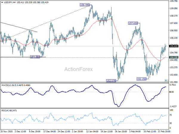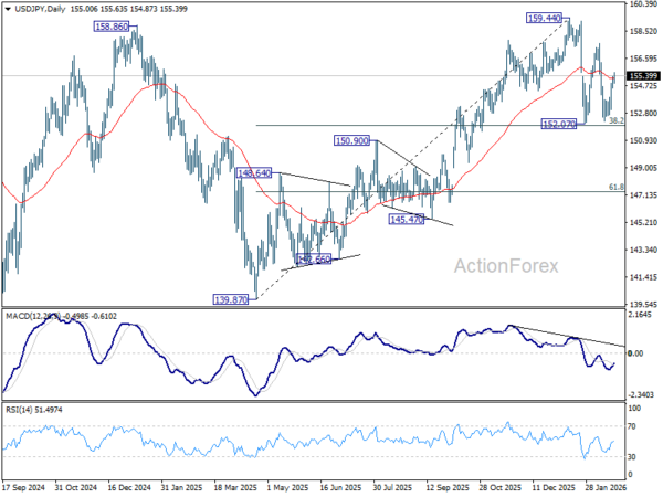 Intraday bias in USD/JPY remains on the upside at this point, as rise from 152.25 is still in progress to 157.65 resistance. Break there will target a retest on 159.44 high. On the downside, below 154.33 minor support will turn intraday bias neutral and bring consolidations. Overall, with 38.2% retracement of 139.87 to 159.44 at 151.96 intact rise from 139.87 is expected to resume through 159.44 at a later stage.