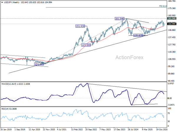 In the bigger picture, outlook is unchanged that corrective pattern from 161.94 (2024 high) should have completed with three waves at 139.87. Larger up trend from 102.58 (2021 low) could be ready to resume through 161.94. This will remain the favored case as long as 55 W EMA (now at 151.71) holds. However, sustained break of 55 W EMA will argue that the pattern from 161.94 is extending with another falling leg.