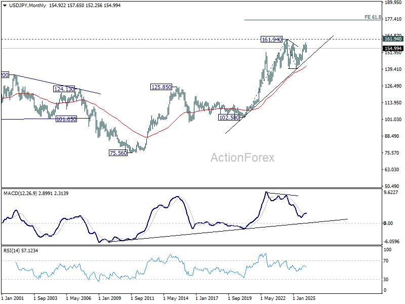 In the long term picture, up trend from 75.56 (2011 low) is still in progress and might be ready to resumption. Firm break of 161.94 will target 61.8% projection of 102.58 (2020 low) to 161.94 (2024 high) from 139.87 at 176.55 in the medium term. Long term outlook will stay bullish as long as 139.87 support holds, even in case of deep pullback.