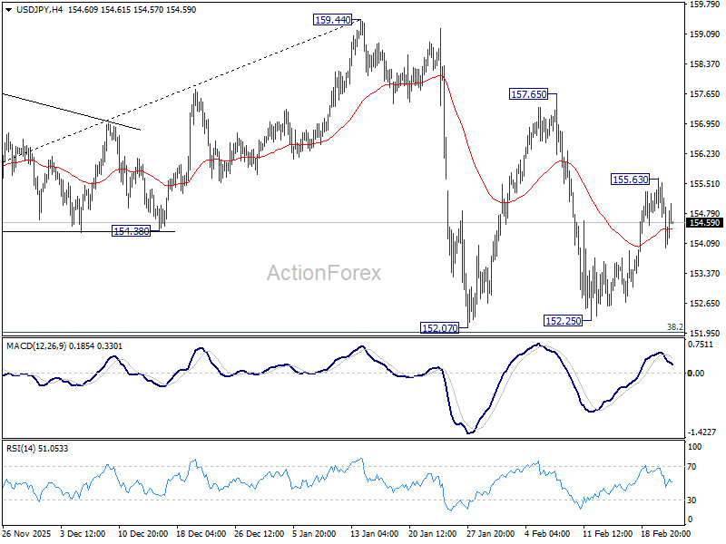USD/JPY recovered after brief initial dip today, but stays below 155.63 temporary top. Intraday bias stays neutral. On the upside, above 155.63 will resume the rally from 152.25 and target 157.65 first. Overall, with 38.2% retracement of 139.87 to 159.44 at 151.96 intact, price actions from 159.44 are seen as a corrective pattern. Also rise from 139.87 is expected to resume through 159.44 at a later stage.
