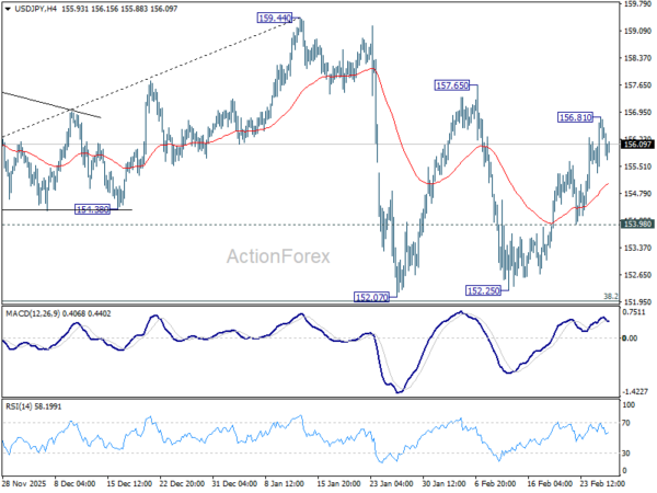 Intraday bias in USD/JPY is turned neutral with current retreat. On the upside, above 156.81 temporary top will resumed the rally from 152.25 to 157.65 resistance first. Firm break there will target a retest on 159.44. high. On the downside, however, break of 153.90 will bring deeper fall to 152.25 support. Overall, with 38.2% retracement of 139.87 to 159.44 at 151.96 intact, price actions from 159.44 are seen as a corrective pattern. Also, rise from 139.87 is expected to resume through 159.44 at a later stage.