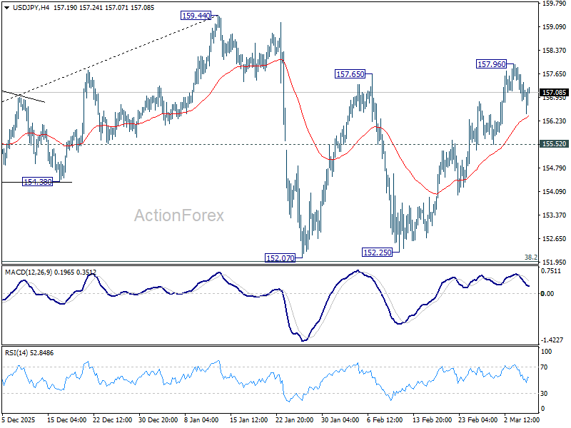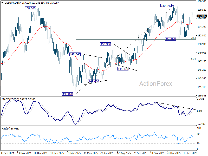 Intraday bias in USD/JPY stays neutral and more consolidations could be seen below 157.97 temporary top. On the upside, above 157.96 will extend the rebound from 152.25 to retest 159.44 high. On the downside, though, break of 155.52 will bring deeper fall back to 152.07/152.25 support zone. Overall, price actions from 159.44 are viewed as a near term consolidation pattern. Outlook will remain bullish as long as 38.2% retracement of 139.87 to 159.44 at 151.96 holds.