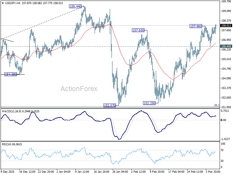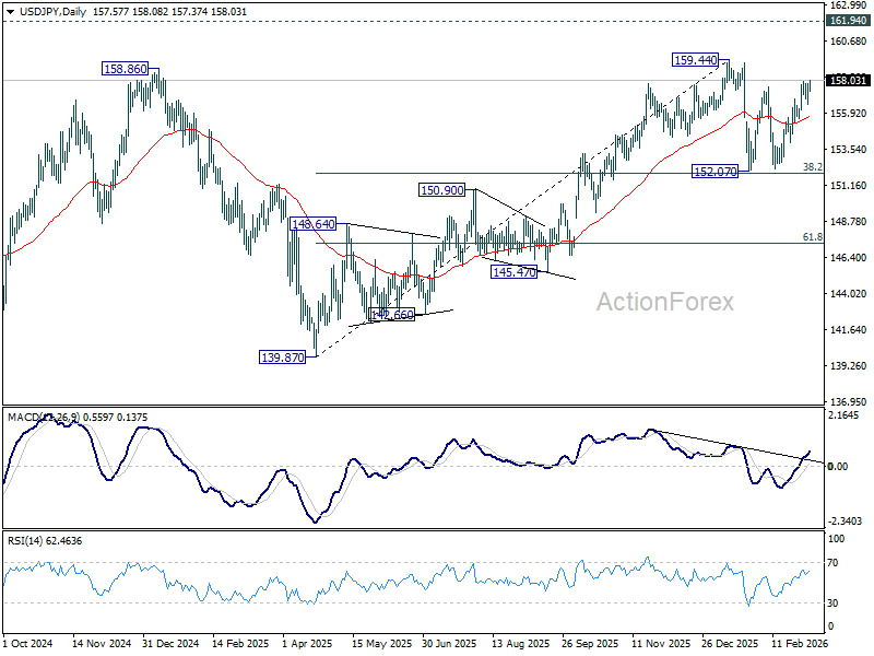 Intraday bias in USD/JPY is back on the upside with breach of 157.96 temporary top. Rise from 152.25 is resuming for retesting 159.44 high next. On the downside, below 156.44 support will turn bias neutral again first. Overall, price actions from 159.44 are viewed as a near term consolidation pattern. Outlook will remain bullish as long as 38.2% retracement of 139.87 to 159.44 at 151.96 holds.