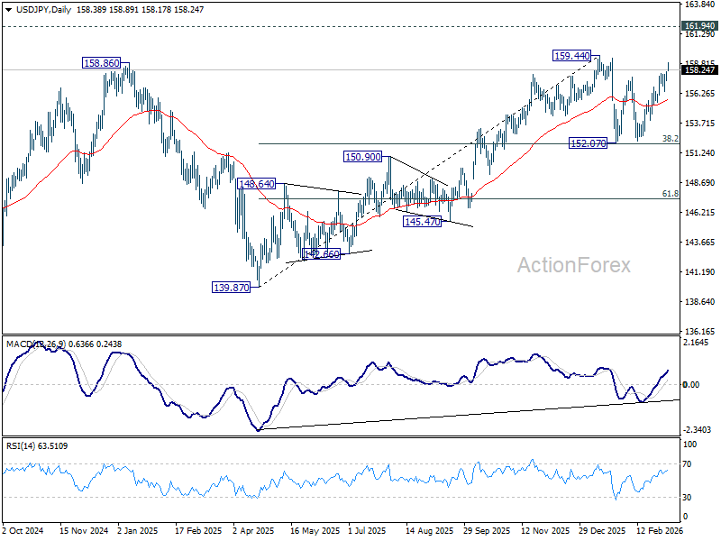 Intraday bias in USD/JPY stays on the upside as rise fro 152.25 is in progress for 159.44 resistance. Decisive break there will target 161.94 high next. On the downside, below 157.38 minor support will turn intraday bias neutral again first. Overall, price actions from 159.44 are viewed as a near term consolidation pattern. Outlook will remain bullish as long as 38.2% retracement of 139.87 to 159.44 at 151.96 holds.
