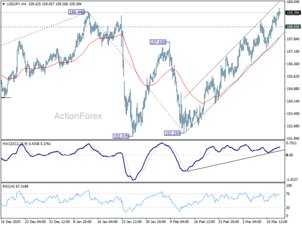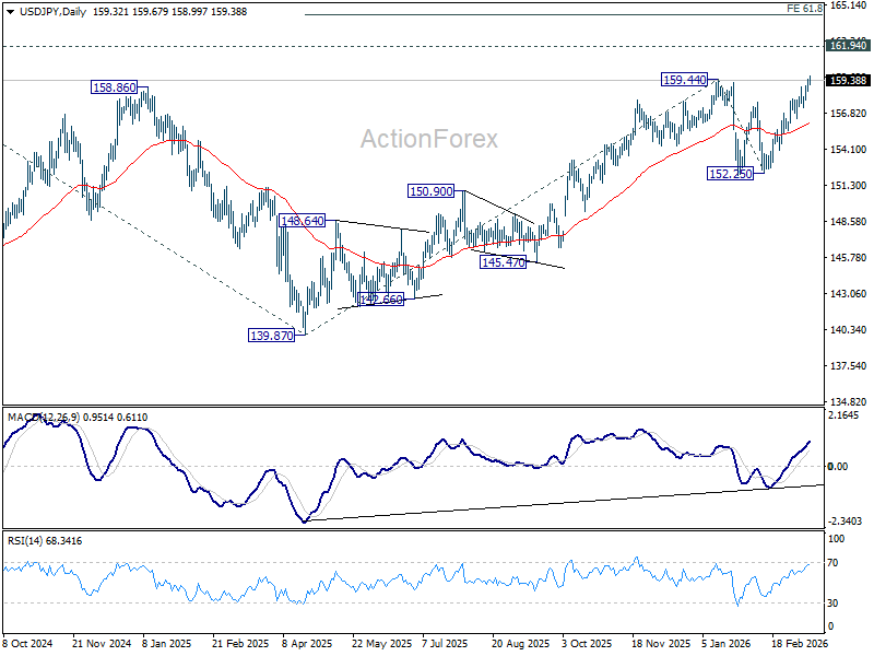 USD/JPY’s break of 159.44 resistance suggests that whole rally from 139.87 is resuming. Intraday bias stays on the upside for retesting 161.94 high. Firm break there will confirm larger up trend resumption. Next target is 61.8% projection of 139.87 to 159.44 from 152.25 at 164.34. On the downside, below 158.55 minor support will turn intraday bias neutral first.
