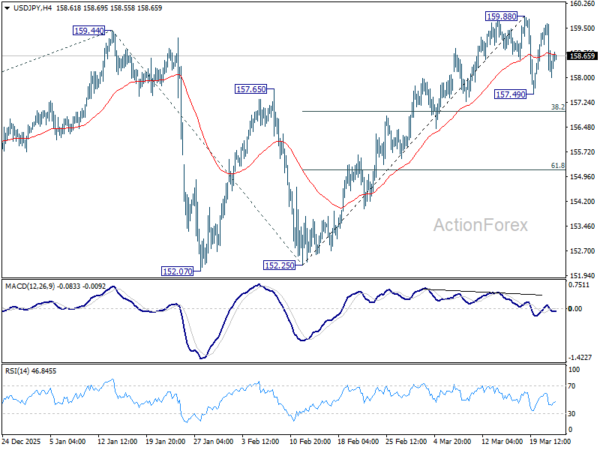 Daily Pivots: (S1) 157.72; (P) 158.69; (R1) 159.40; More…