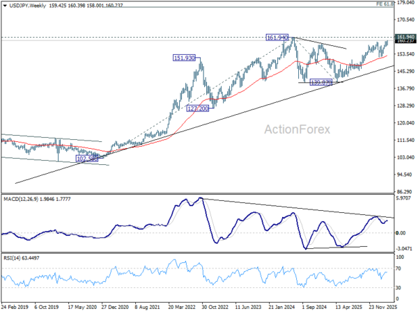 In the bigger picture, outlook is unchanged that corrective pattern from 161.94 (2024 high) should have completed with three waves at 139.87. Larger up trend from 102.58 (2021 low) could be ready to resume through 161.94. This will remain the favored case as long as 55 W EMA (now at 152.97) holds. Firm break of 161.94 will pave the way to 61.8% projection of 102.58 to 161.94 from 139.87 at 176.75.