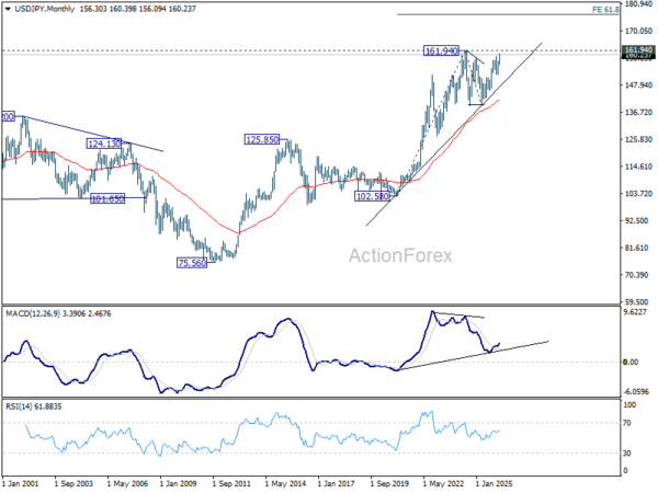 In the long term picture, up trend from 75.56 (2011 low) is still in progress and might be ready to resume. Firm break of 161.94 will target 61.8% projection of 102.58 (2020 low) to 161.94 (2024 high) from 139.87 at 176.55 in the medium term. Long term outlook will stay bullish as long as 139.87 support holds, even in case of deep pullback.